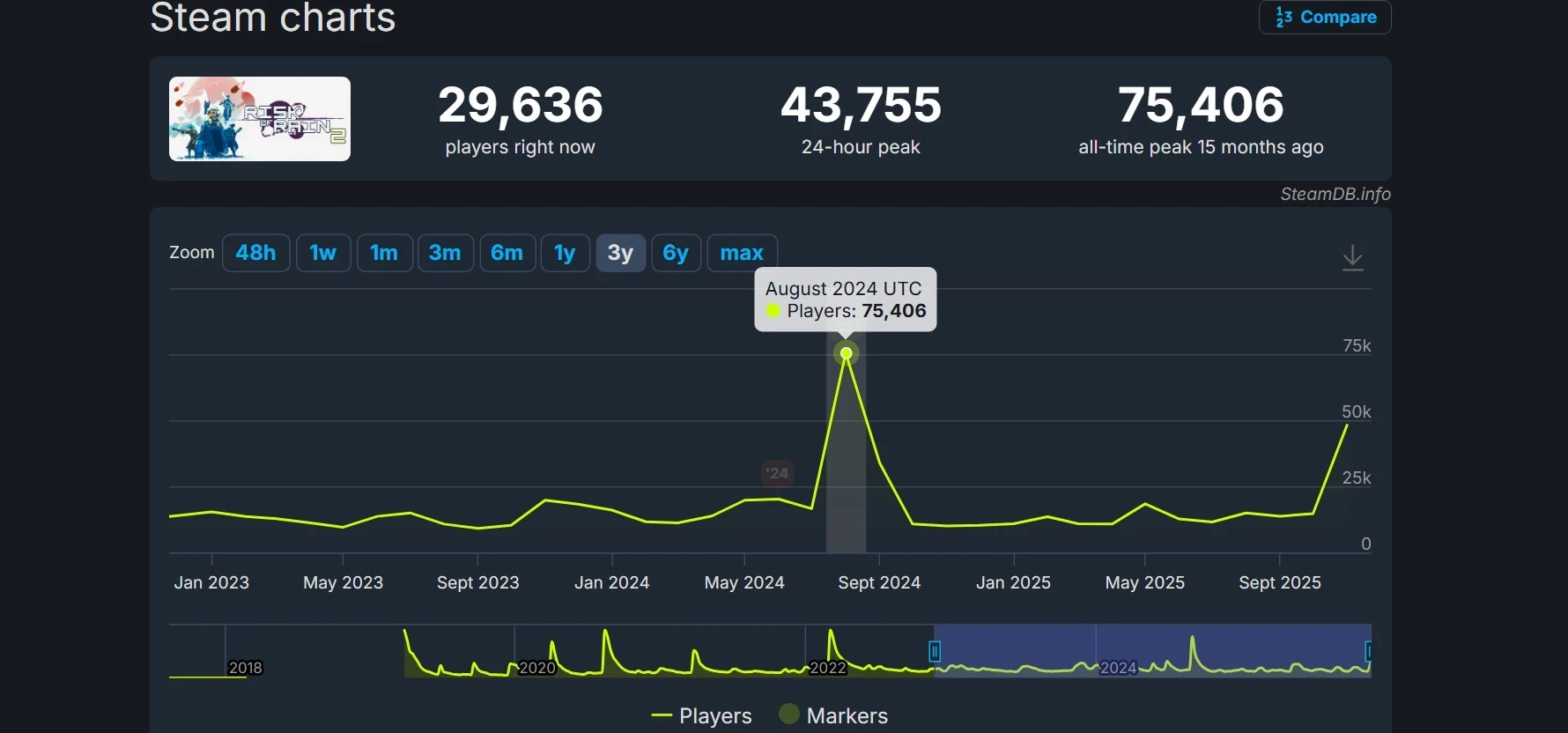 Свежее дополнение заметно увеличило онлайн Risk of Rain 2. 19 ноября он превысил 48 тысяч человек. В последний раз показатели выше наблюдались лишь в августе 2024 года в момент выхода DLC под названием Seekers of the Storm. Оно столкнулось с критикой и до сих пор остаётся со «смешанными» пользовательскими отзывами.