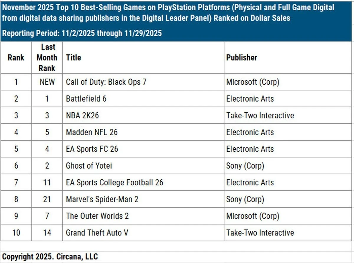 Следом за игрой EA вновь идут NBA 2K26 и Monster Hunter Wilds. А единственная новинка ноября, Call of Duty: Black Ops 7, расположилась только на седьмом месте.
