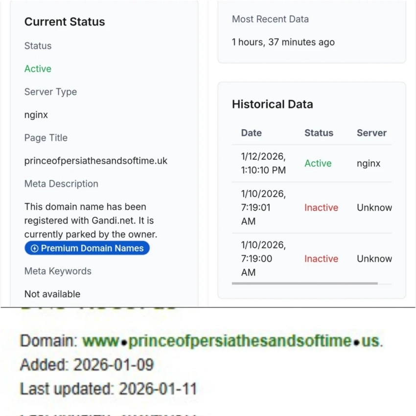 К примеру, статусы доменов princeofpersiathesandsoftime.uk и assassinscreedblackflagresynced.com — их можно видеть на скриншотах ниже — меняются между «активный» и «неактивный». Также появляются записи о новых данных.