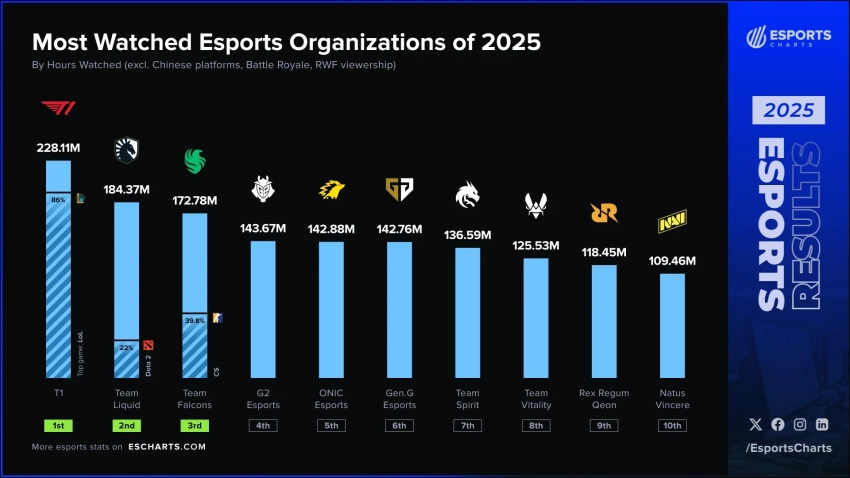 Топ— 10 самых популярных киберспортивных клубов 2025 года по часам просмотра