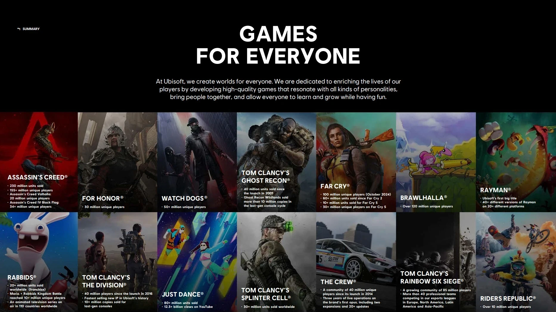• серия Rabbids — свыше 20 миллионов проданных копий, а также более 10 миллионов уникальных игроков Mario + Rabbids Kingdom Battle.