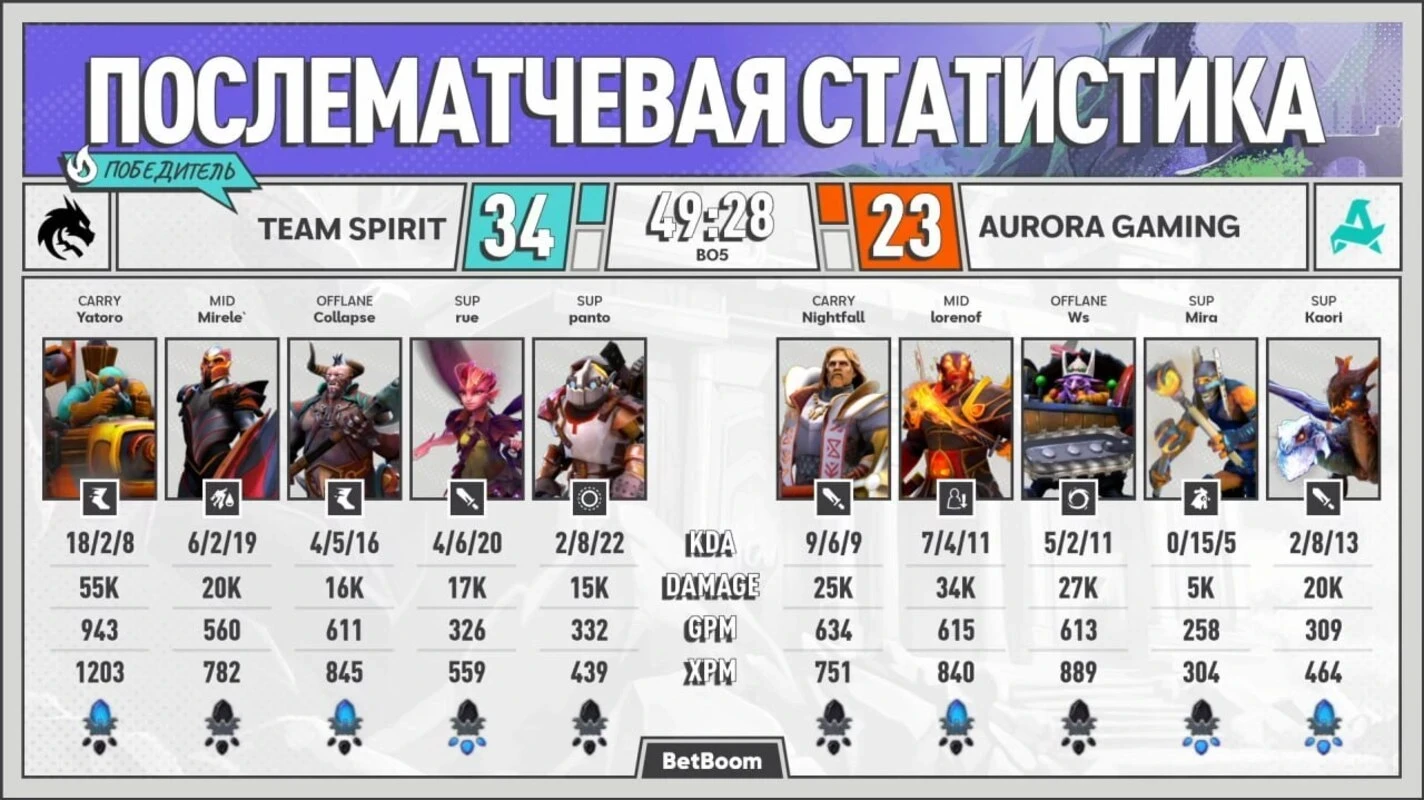• Илья «Yatoro» Мулярчук на Morphling завершил карту с KDA 12/1/5. Он стал абсолютно лучшим игроком матча по всем показателям: 35,317 нетворса и 32,132 урона по героям.