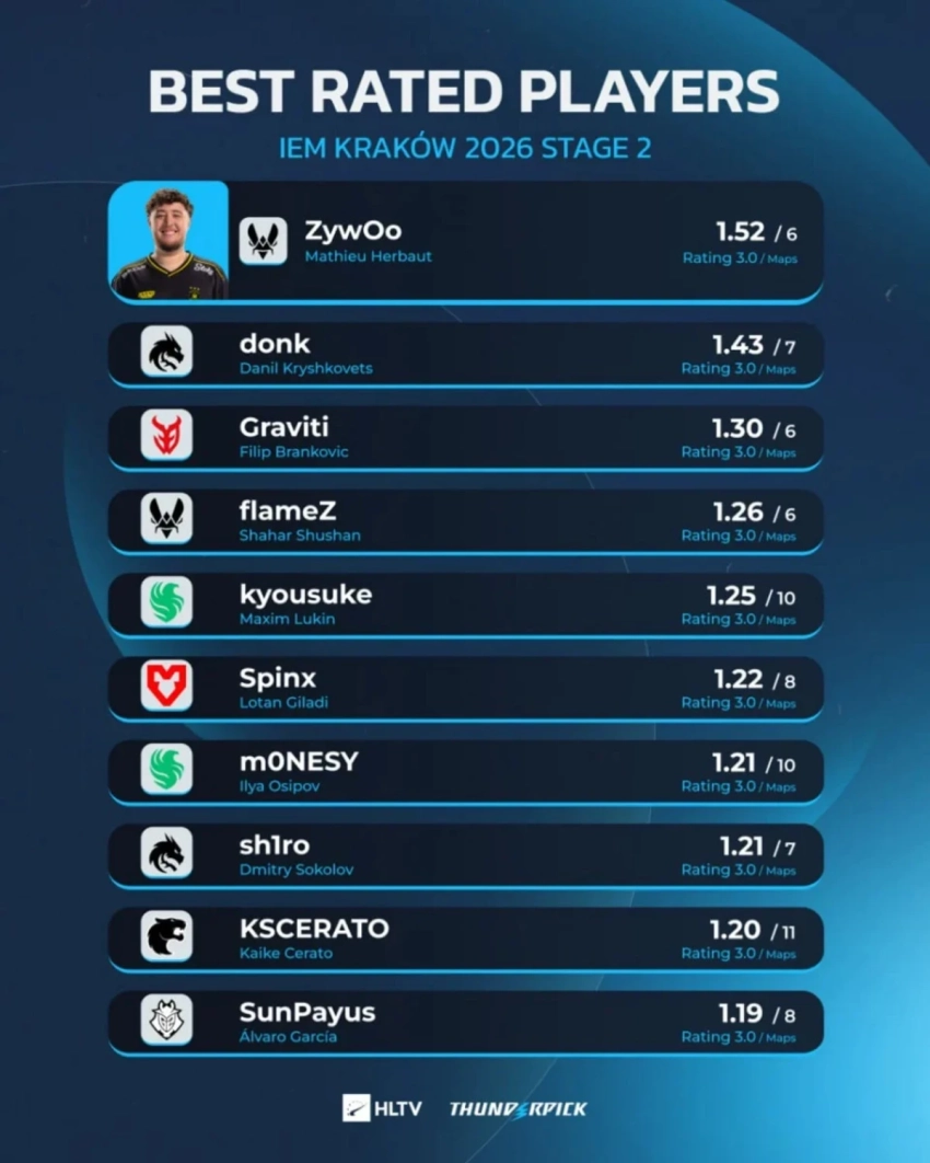 Главная » Статьи » ZywOo обошел donk и стал лучшим игроком групповой стадии IEM Kraków 2026 по Counter-Strike 2