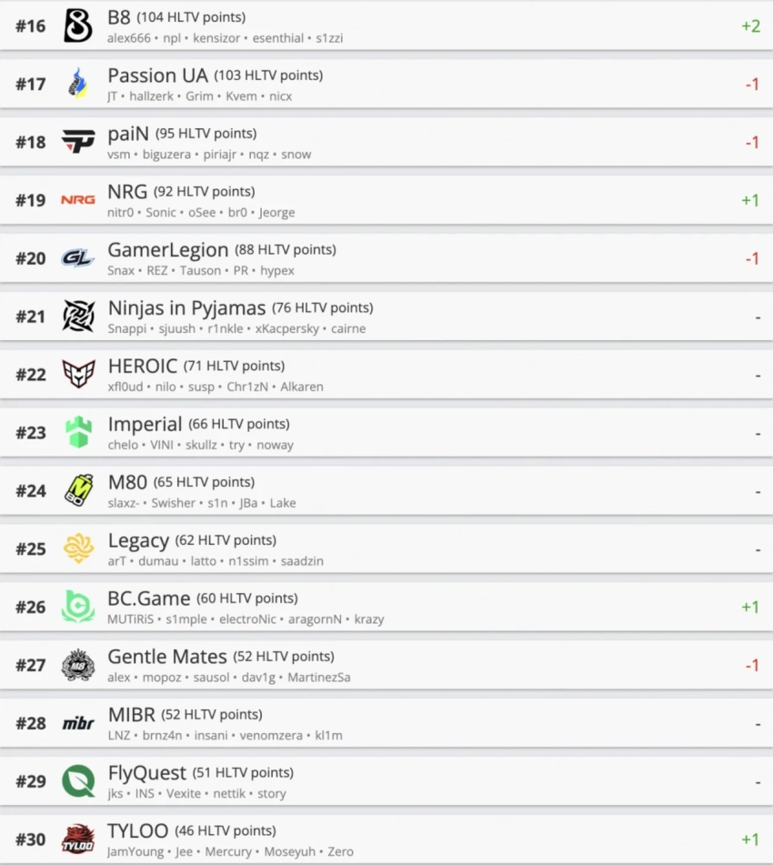 За пределами элиты также произошли заметные сдвиги. Украинский клуб B8 Esports поднялся на две позиции и теперь занимает 16-е место. Другие изменения согласно данным рейтинга: