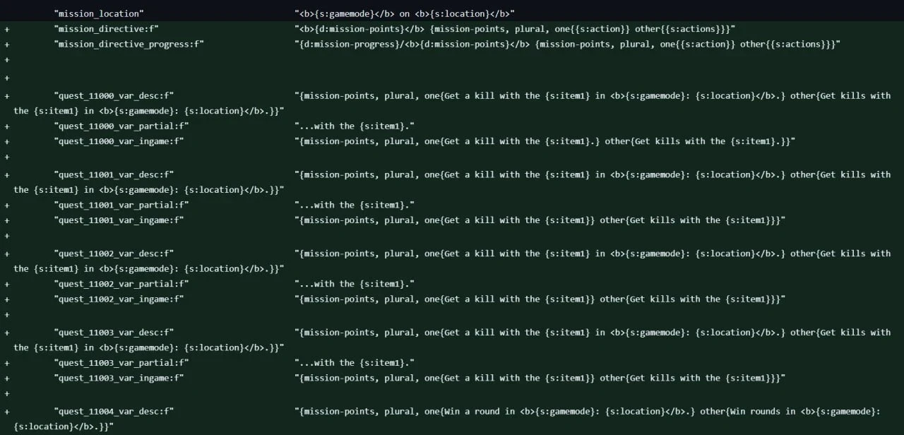 В коде также найдены старые токены локализации для квестов (например, «Get a kill with the {s: item1}»). Возвращение системы миссий и упоминание очков прогресса (mission-points) практически прямо указывает на разработку новой Операции или схожего ивента.